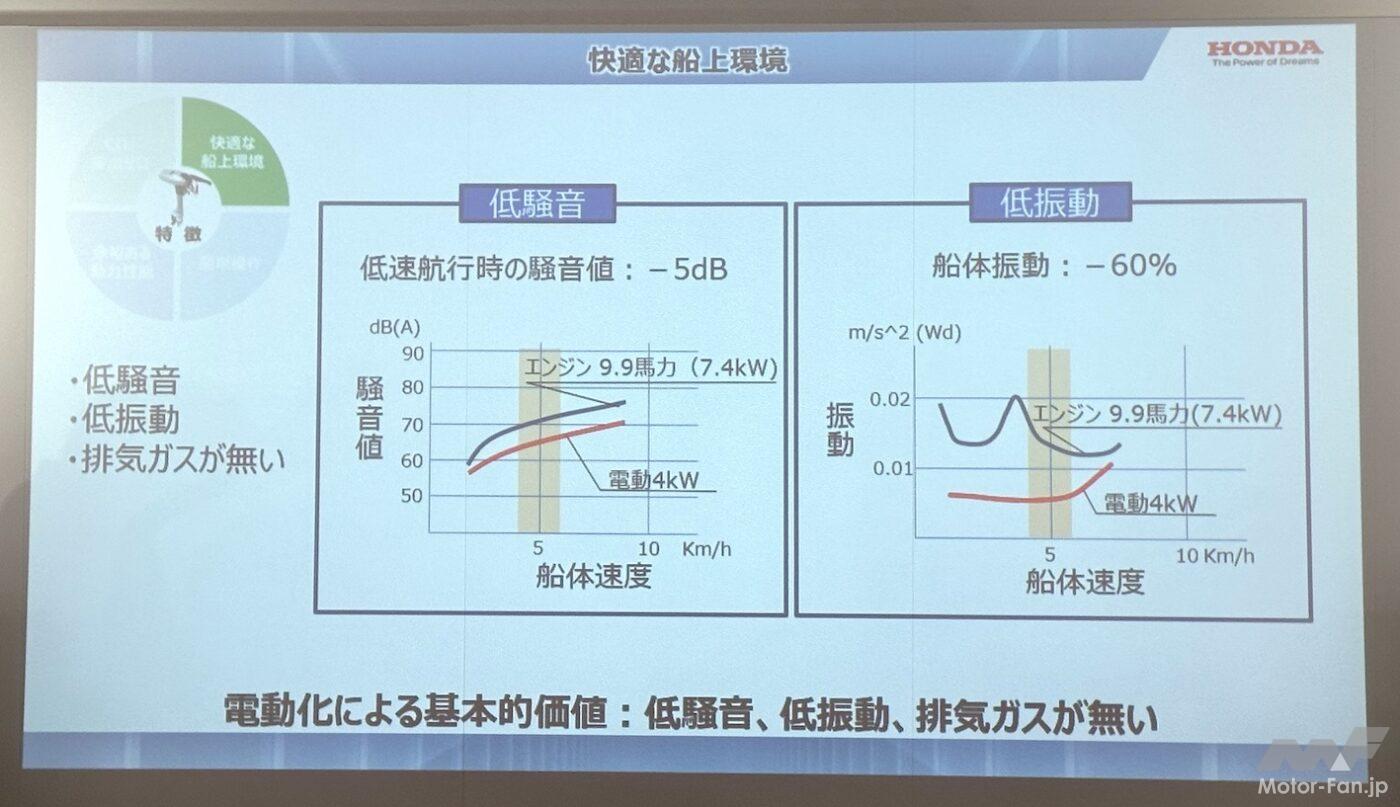 圧倒的に静かだ。低速航行時(5km/h)の騒音値はエンジン7.3kWに対して-5dB、船体振動は-60%。-5dBと言われてもピンとこないかもしれないが、まったく違う世界だ。