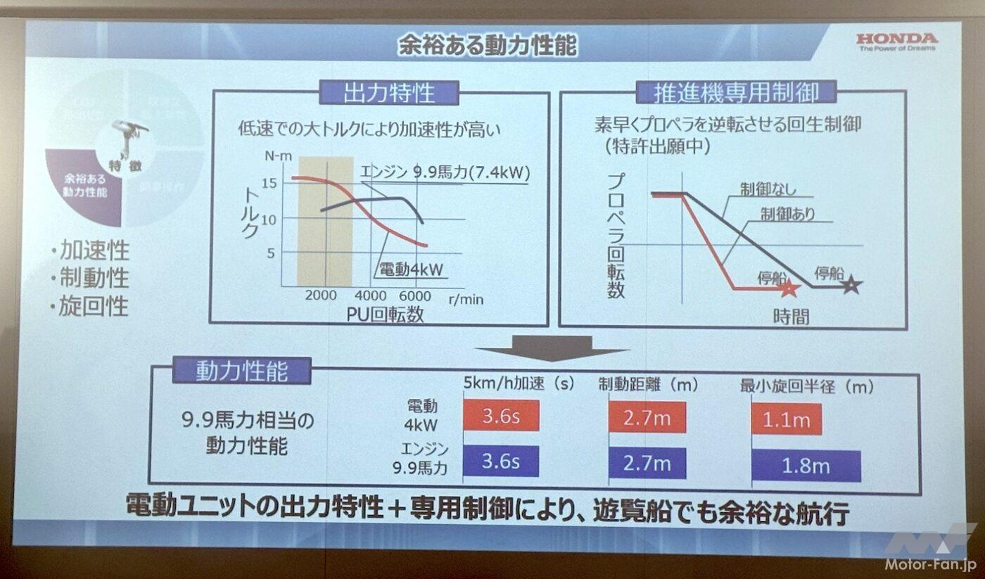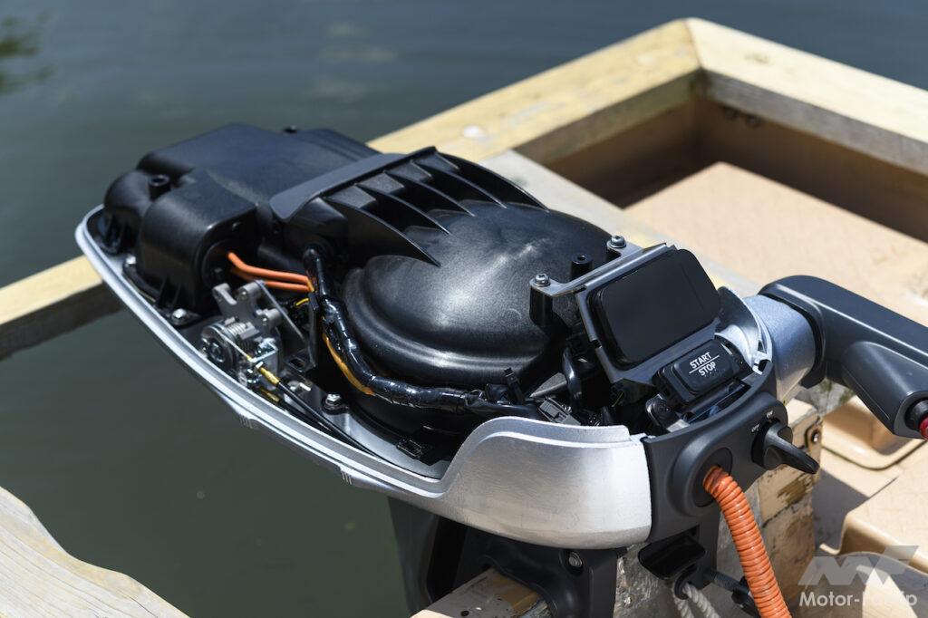 船外機だから制動はプロペラを反転させることで行なう。素早くプロペラを反転させる回生制御(特許出願中)を組み込んでいる。回生制御といっても、エネルギー回生が目的というより早く反転させるための制御だという。