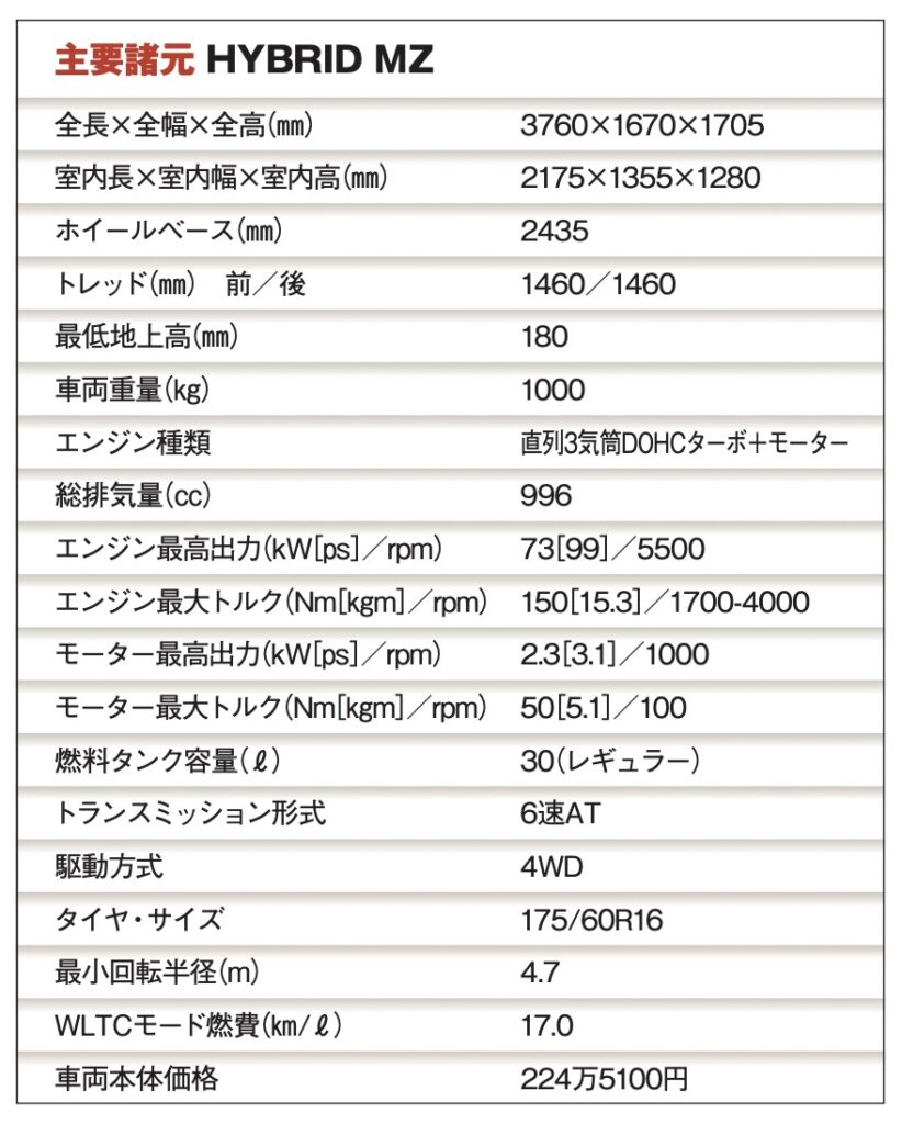 大きな特徴は全幅1670㎜のナローな車幅。ハスラー同様に雪国のユーザーの声に応えたモデルだけに、最低地上高180㎜に加え、4WDモデルにはスポーツ/スノーの走行モード、グリップコントロール、ヒルディセントコントロールを完備。雪道を含めた走破性に定評がある。