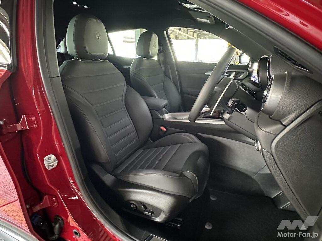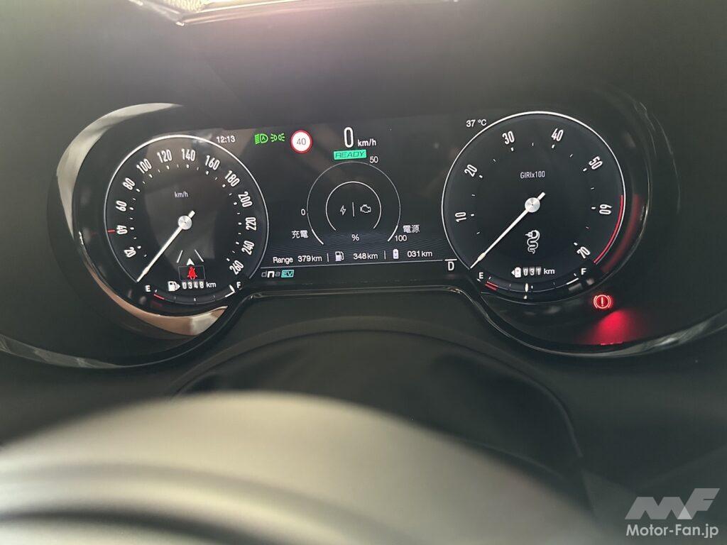 ほぼフル充電の状態で乗り込んだ。インテリア、シートは、「あぁ、アルファだな」と思える設え。すべてがデザインされていてややメカメカしい。隠れアルフィスタ(かつてアルファ156をV6、ツインスパークと2台乗り継いだ経験がある)としては、座っただけでちょっとうれしくなる。