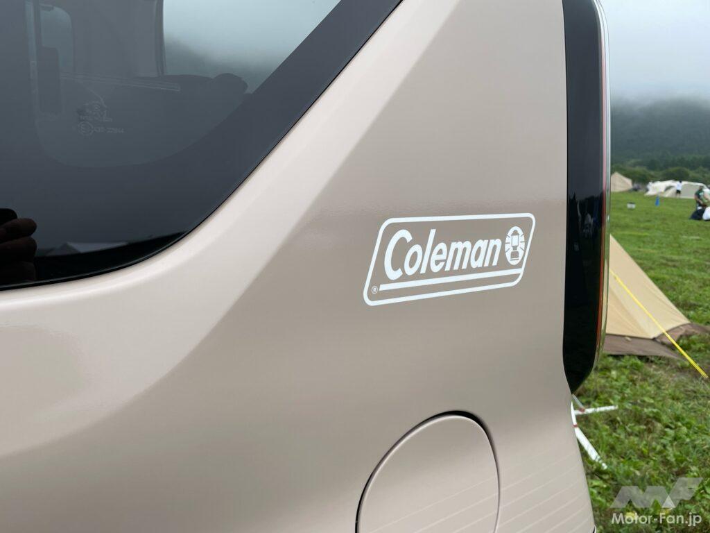 グレージュのラッピングシートは、ボディサイドにはストライブ柄を施し、左右フロントドアにはランタンマークのロゴ、リヤクォーターパネルとリヤゲートにはコールマンのロゴを配している。