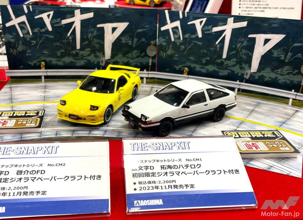 さて、近年のアオシマのカーモデルのヒット作と言えば接着不要、塗装不要の『ザ☆スナップキット』シリーズだが、アニメ化もされた人気コミックス『頭文字D』から主人公の駆るAE86とライバルの愛車FD3が登場。初回限定で手軽にコミックスの名シーンが再現できるペーパークラフトの背景が付属する。2023年11月発売予定、各2200円(税込・予価)。