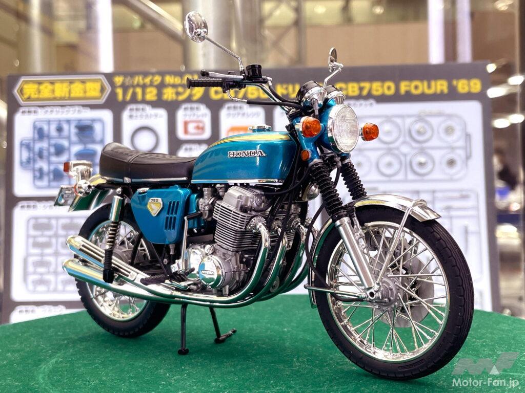 カーモデルだけでなくバイクモデルにも力を入れているアオシマは、1/12『ザ☆バイク』シリーズのNo.1としてホンダ CB750 ドリーム CB750 FOUR ’69を2023年12月に発売予定。これは1969年に発売された、ホンダ・ドリーム CB750FOURことK0(Kゼロ)の初期型“砂型モデル”を完全新金型で精密モデル化したもの。リヤサスには金属バネを使用しリアリティを追求。会場には実車と単体エンジンも展示する力の入れようだ(予価4400円・税込)。エンブレムやシートモール、コード、バンド類などが付属して、よりリアリティを高めるディティールアップパーツセットもキットと同時発売される(予価3080円・税込)。