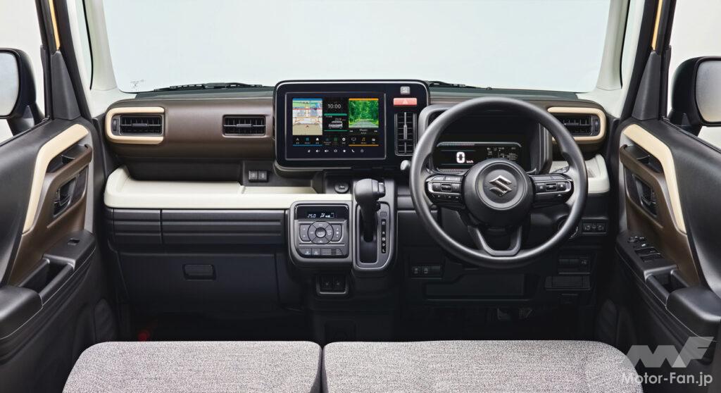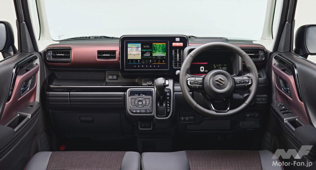 スペーシア/スペーシアカスタムのインテリアは時流に合わせてセンターのディスプレイを拡大しているが、基本的にはキープコンセプトのレイアウトとデザインにになっている。