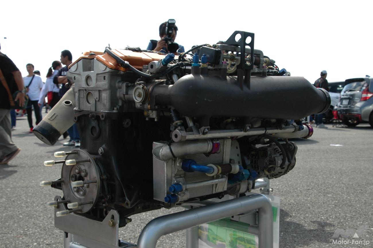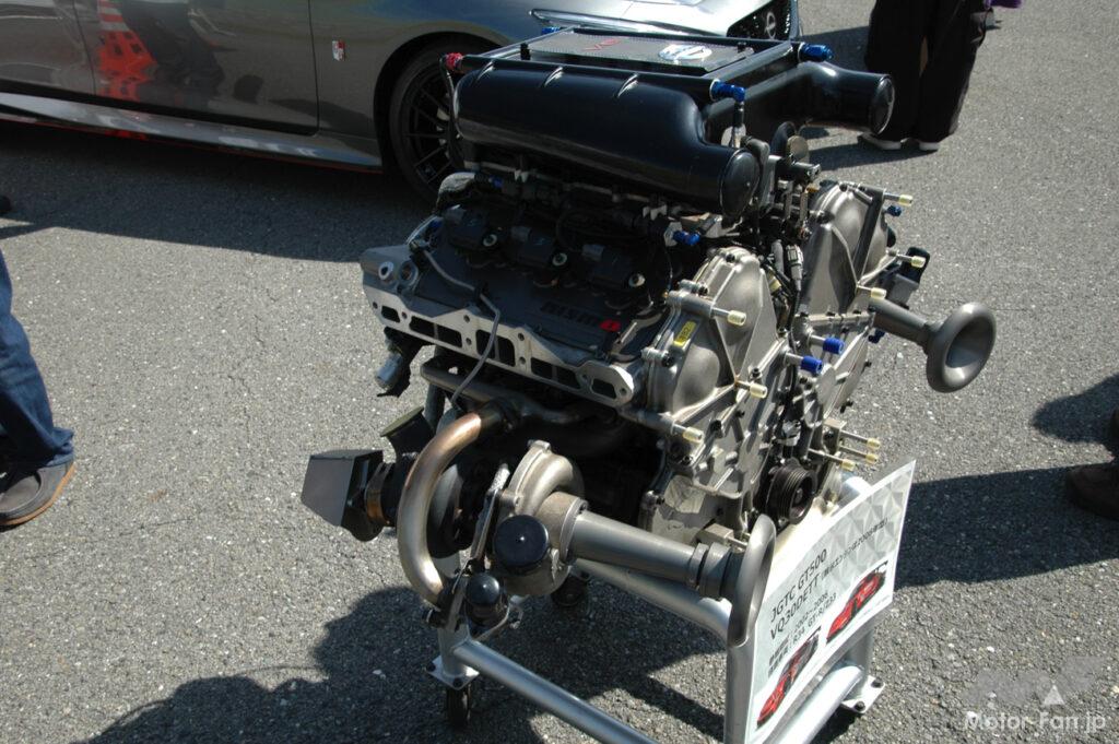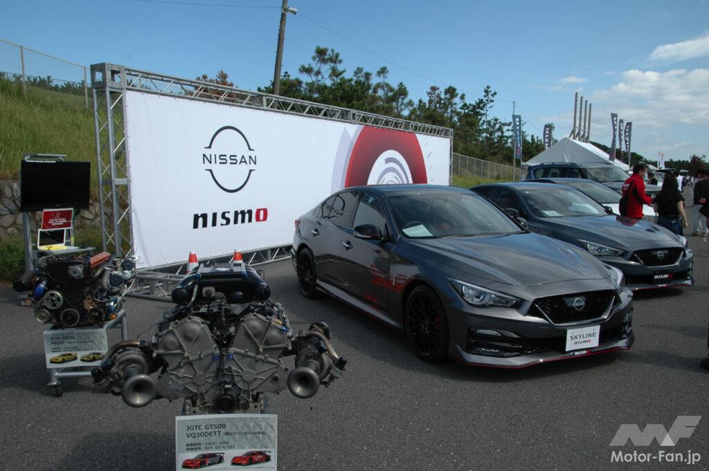 発表から話題沸騰のスカイラインNISMOも、カスタマイズパーツ装着車と合わせて展示され注目を集めた。NISMOロードカーだけに、スーパーGT(JGTC)で活躍したレーシングエンジン2機、RB26J型とVQ30DETTも合わせて展示され、レーシングイメージを強くアピールしていた。