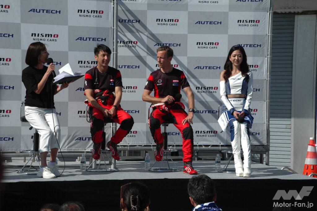 例年、日産で活躍するレーシングドライバーとチームのレースクイーンがゲストとして登場するこのイベントだが、今年はスーパーGTのGT500クラスでMOTUL AUTECH Z(23号車)をドライブする松田次生選手とロニー・クインタレッリ選手が登壇。前述の2023AUTECHレースクイーンの高岡みほさんと共にトークショーや恒例のじゃんけん大会で会場を盛り上げた。