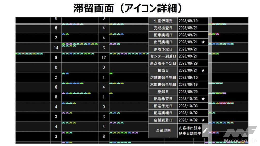 販売店の店頭では、営業スタッフがパソコンで商談支援ツールを開き、顧客の要望するオプションなどを入力していくと、商談時点での生産予定日を確認することができる仕組みになっている。事前に納期がわかるので、顧客への連絡や書類の準備を効率良く行なうことができ、車両の生産完了から納車までのリードタイム短縮につながっているという。納期が明確に分かるので、顧客に対してサバを読んだ納期を伝える必要がないし、納期が二転三転することもすることにない。
