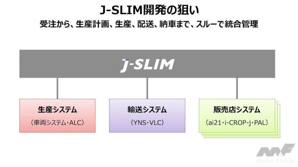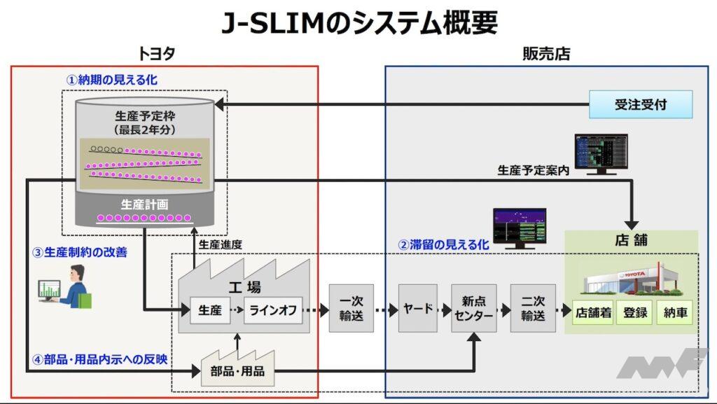 J-SLIMのJは日本(Japan)の意。SLIMはSales Logistics Integrated Managementの頭文字をつなげたものだ。従来は生産(トヨタ自動車)と販売(国内各地の販売店)で一体となっているとは言いがたかった需給システムを根本から見直し、受注から生産計画、生産、配送、納車までを一貫して統合管理することにした。これにより、納期の見える化が実現し、結果として納期の短縮につながっている(例外もある)。