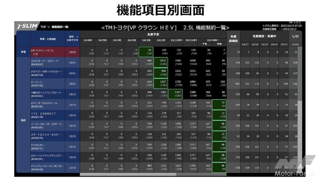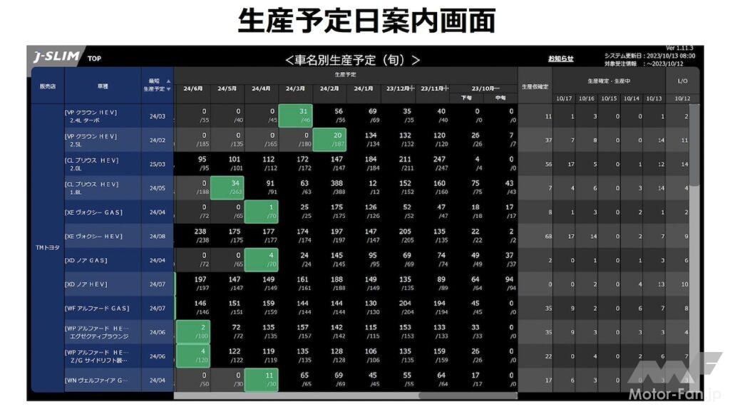 いっぽうで、生産された車両も生産から納車までのリードタイム管理が不十分だったので、タマ不足(注文しても納車までに時間がかかる)の状況だったにもかかわらず、販売店には未登録の車両が滞留していた。こうした状況を解決するのがJ-SLIMで、生産から納車までを生産側からも販売側からも1台1台見える化し、一貫して統合管理する。