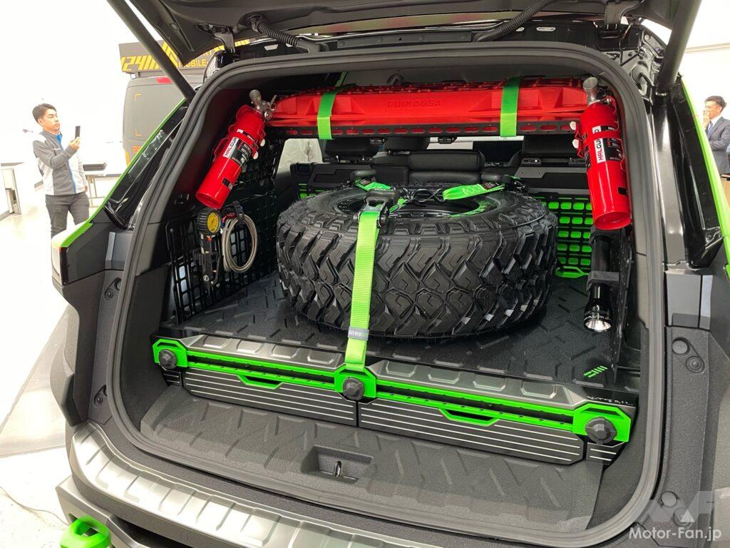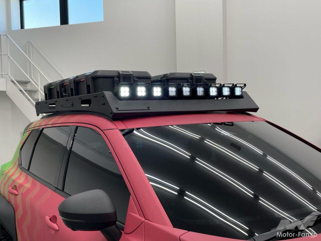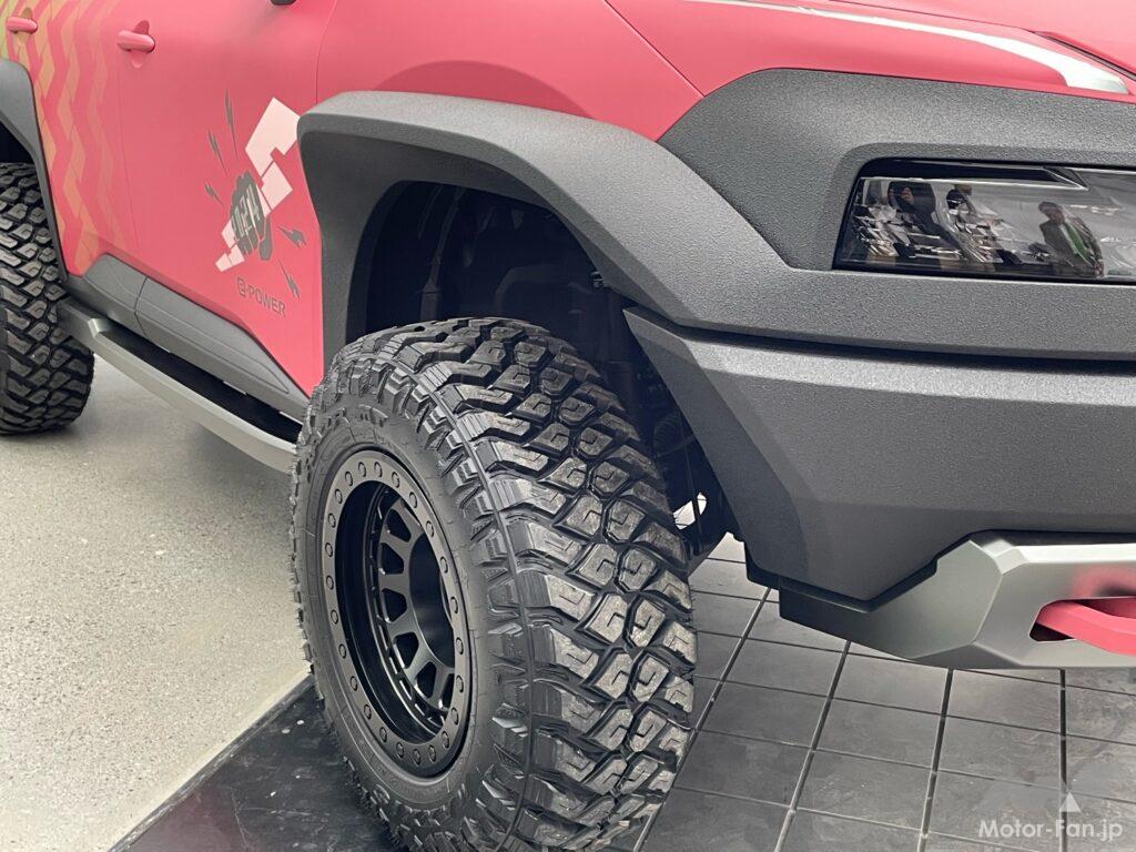 エクステリアの特徴は、専用の17インチアルミホイールとオフロードタイヤの組み合わせ、専用オーバーフェンダー、5インチのリフトアップ、ルーフラックなどで、傾斜がきつく険しい地形をクルマにて走破するロッククローリングの世界を表現。そして、斬新なピンクとライムグリーンのボディーカラーで突き抜けたインパクトのある外観を実現している。こちらは塗装ではなくフルラッピングで仕上げている。