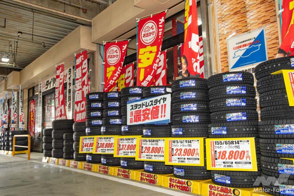 店舗の一等地に構えるタイヤ売り場には、お得なタイヤ・ホイールセットをはじめ、様々なブランドのスタッドレスタイヤが陳列されていた。近頃はオールシーズンタイヤの需要も高まっており、在庫を充実させているそうだ。