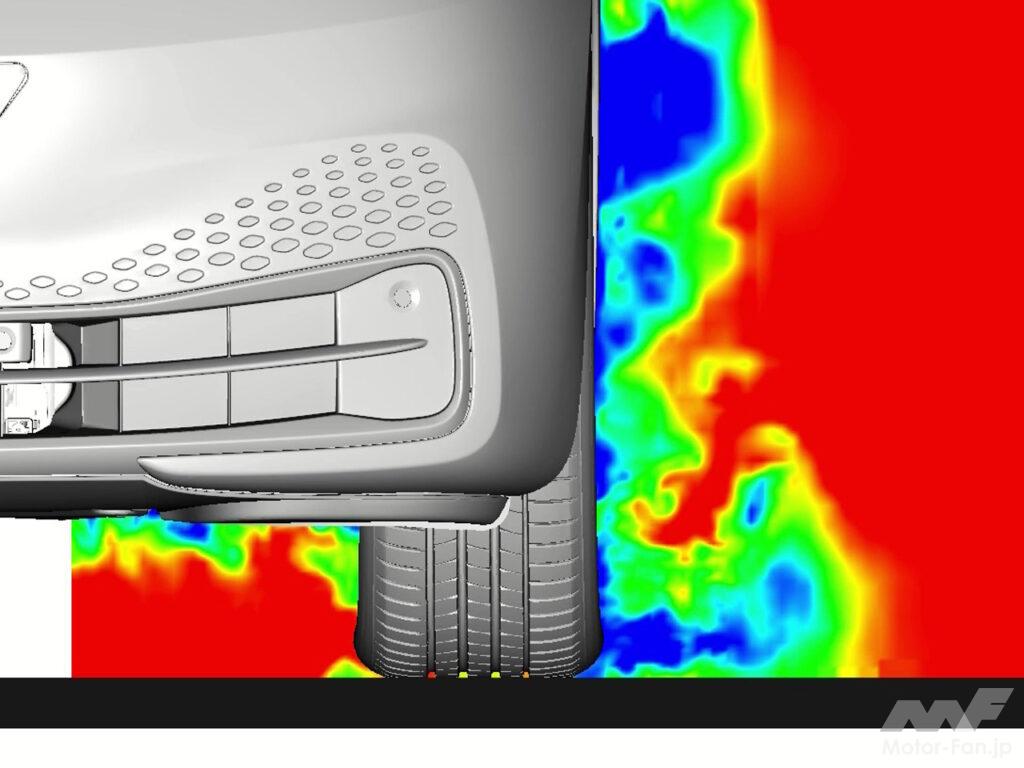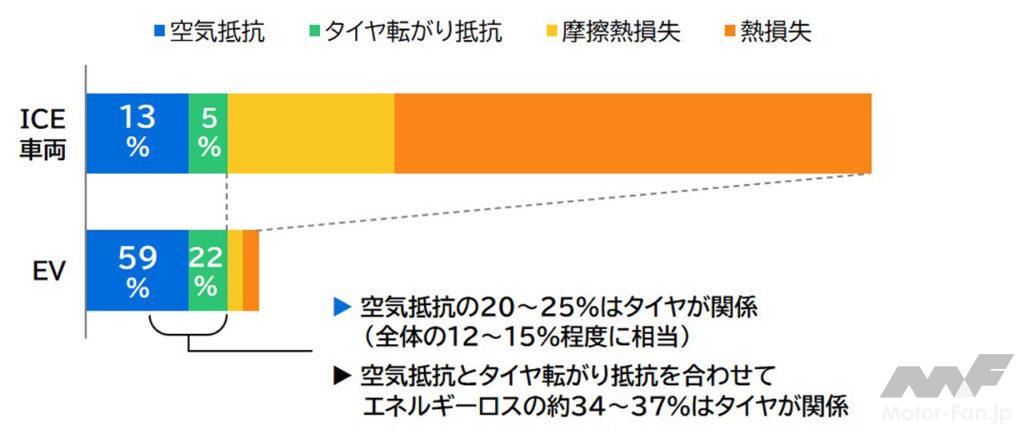 EVへの変化が急速に進む現在、ICE(内燃機関)車両で過半を占める熱によるエネルギーロスがEVではほとんどなくなり、空気抵抗の影響が相対的に増加する。タイヤは車体から露出しており、タイヤ付近を経由した空気は車両下部や側面にも大きくはみ出して流れるため、乗用車の空気抵抗によるエネルギーロスのうち20~25%はタイヤが関係する。熱によるエネルギーロスがほとんどないEVでは、転がり抵抗と合わせるとエネルギーロスの約34~37%がタイヤによるものとなるのだ。