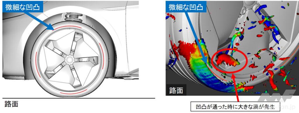 今回新たに開発された「タイヤ空力シミュレーション」は、タイヤ付近の空気抵抗を可視化するシミュレーション技術。実車両データを用いることや、タイヤのパターンを再現したうえで、車重による接地部分のタイヤ形状変化も含めて、結果の分析にAI技術を活用しながらタイヤの回転による空力を計算できることが特徴だ。さらにこれに加えて今回、タイヤのサイドウォールの文字や微細な凹凸がパターン同様に回転しながら変形するシミュレーション技術を開発。EVタイヤにおいてはサイドウォール部の凹凸を少なくし、空気抵抗を低減することが重要だが、今回開発されたシミュレーション技術を活用することで、デザインと空力性能をより高次元で両立させたタイヤ開発が可能となる。