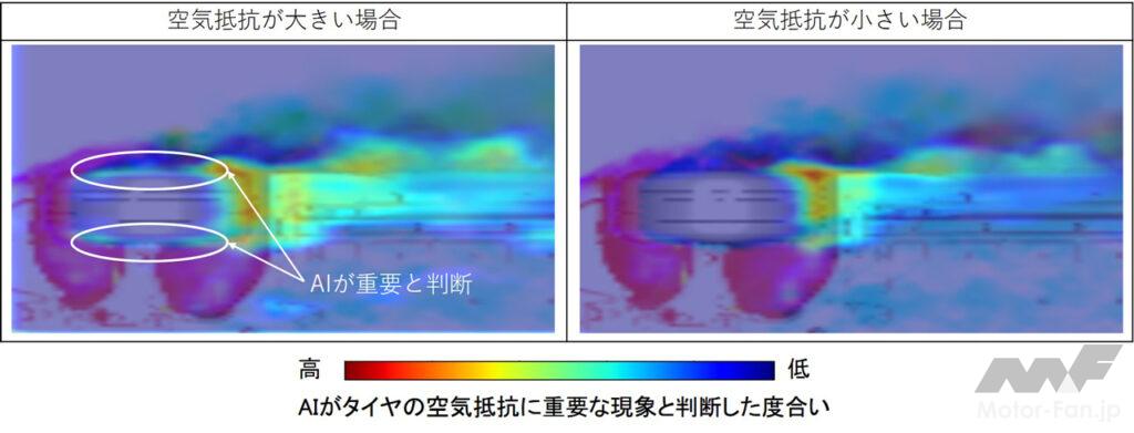 シミュレーションの精度を確認するために実施した実車による風洞実験結果と比較して、タイヤ後方の気流の傾向やサイドウォール部の凹凸を少なくしたEVタイヤの方が、標準タイヤよりも空気抵抗値が低くなり、その変化量も一致したことから有用性を確認。また、AIも空気抵抗が大きい時はサイドウォール部がタイヤの空気抵抗に重要な位置であると示唆しており、このAI技術の有効性も確認できた。この技術を活用することで、空力特性の最適化によるタイヤ性能向上を図り、転がり抵抗低減と合わせてEVの電費性能向上に貢献する。
