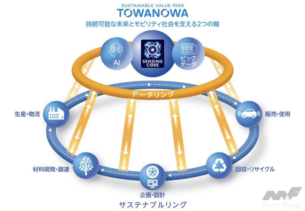 同社は昨年3月に、タイヤ事業における独自のサーキュラーエコノミー構想「TOWANOWA(トワノワ)」を発表した。「TOWANOWA」はバリューチェーン上の5つのプロセスからなる「サステナブルリング」と各プロセスから収集したビッグデータを連携させる「データリング」で構成されており、ふたつのリング間でデータを共有・活用することで新たな価値提供を目指す。