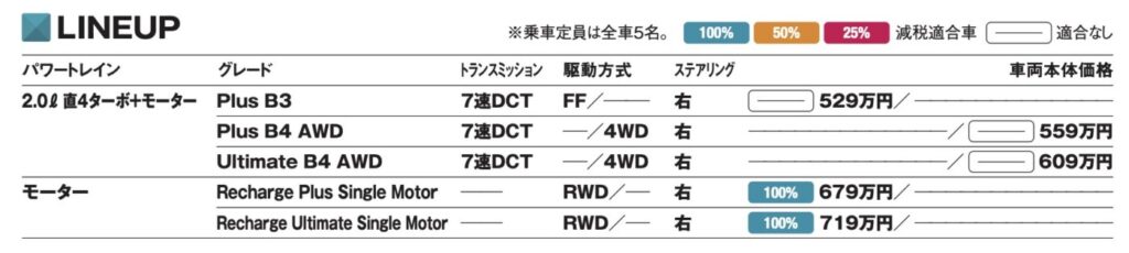 一方、529万円から買えるマイルドハイブリッドはEVモデルに対して車重が軽いため軽快ですっきりとしたドライブフィールが特徴で、動力性能や乗り心地にも十分満足できる。ちなみに24年モデルのRechargeはパワー&トルクアップしたシングルモーター搭載の後輪駆動に変更されている。