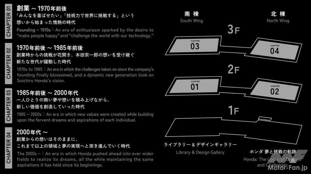今回のリニューアルでは、ホンダが紡いできた「夢と挑戦の物語」を体感できる展示へと進化。創業以来の軌跡を記したパネルを各階に設置し、音声ガイドやスタッフによるツアーとあわせて、ホンダのフィロソフィーや歴史を視覚・聴覚で体感できるようになっている。