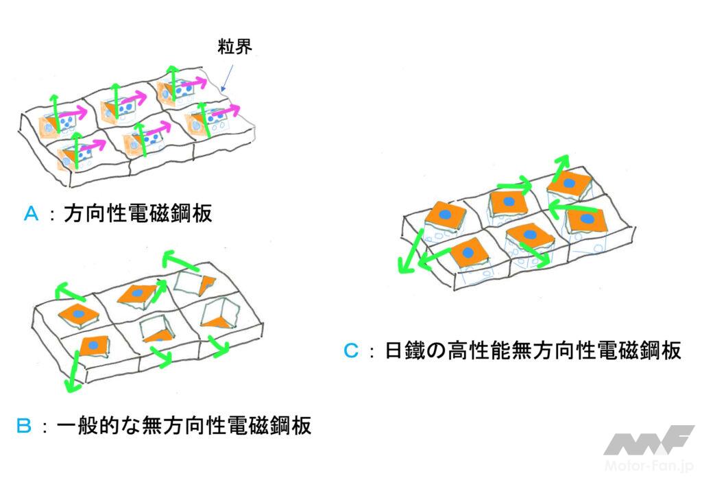 前回掲載した筆者手描きの図をもう一度掲載する。方向性電磁鋼板は、結晶の方向を「同一方向」に揃える技術で作られる。この結晶制御技術については、日鉄が2012年に韓国・ポスコとその元従業員を訴え、その後2015年に和解金300億円で和解している。