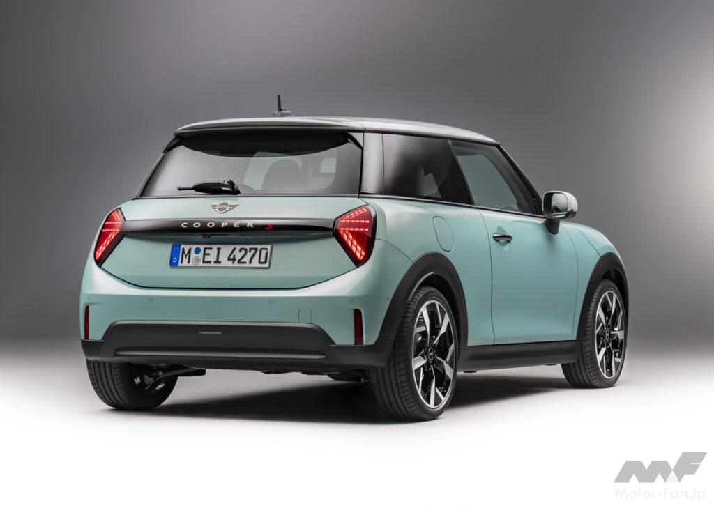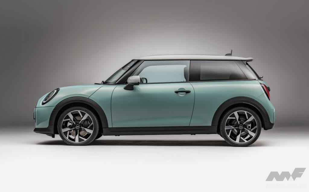 全長3875×全幅1745×全高1455(EVモデルは全長3860×全幅1755×全高1460)mm、ホイールベース2495mmのディメンションを持つ新型は、MINIのDNAを継承しつつ、新世代モデルであることを象徴するミニマルな新しいデザインに刷新。パワートレインの違いや航続距離に影響するエアロダイナミクスを考慮し、デザイン細部を調整。とくにEVモデルの新型MINI クーパーE ドアおよびMINI クーパーSE3ドアにおいては、重要なものだけを残したクリーンなサーフェスが特徴的で、ボンネットスクープ、サイドスカットル、ホイールアーチの加飾、ロッドアンテナ等を廃止し、フラッシュドアハンドルおよびフィンアンテナを採用している。