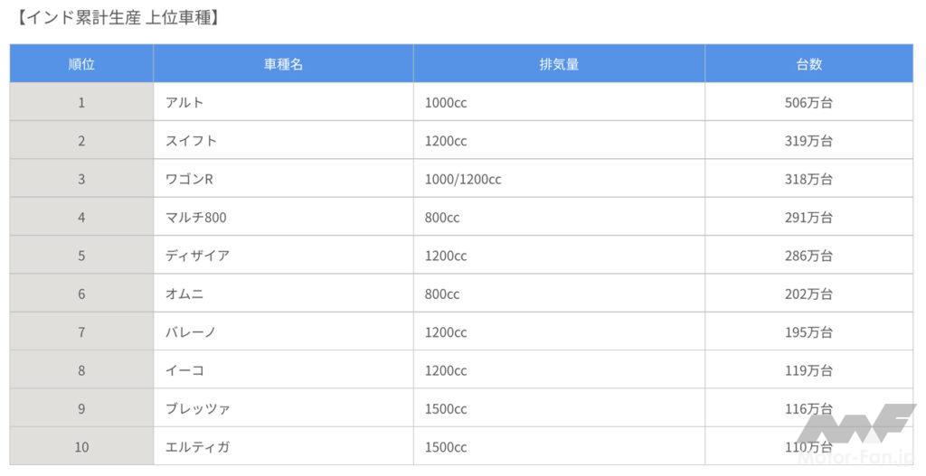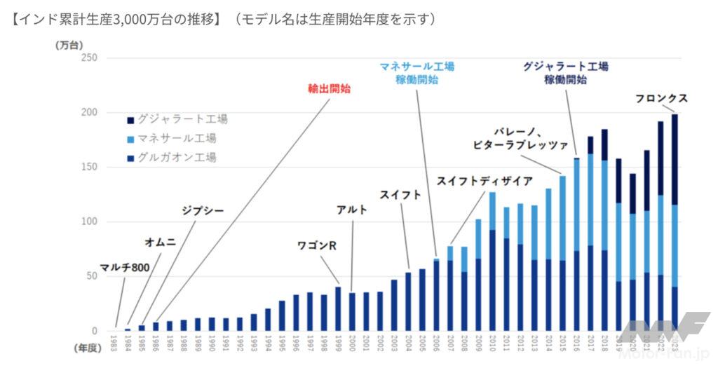 スズキは1983年12月に、現在の子会社マルチ・スズキ社の前身であるマルチ・ウドヨグ社で生産第一号車「マルチ800」をラインオフした。現在では、マルチ・スズキ社のグルガオン工場とマネサール工場に加え、スズキ・モーター・グジャラート社のグジャラート工場の3拠点で、小型車「ワゴンR」「スイフト」「バレーノ」や、SUV「ブレッツァ」「フロンクス」など16車種を生産している。