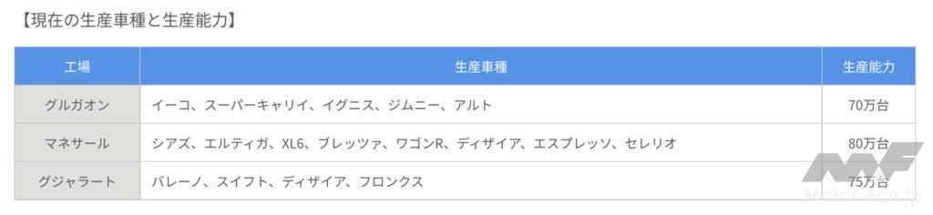 現在の年間生産能力は225万台で、今後のインド四輪市場の拡大に備え、2030年度までに約400万台の生産能力を確保できるよう、2025年にハリヤナ州のカルコダ新工場、また2028年度にはグジャラート州のグジャラート新工場の稼働を予定している。