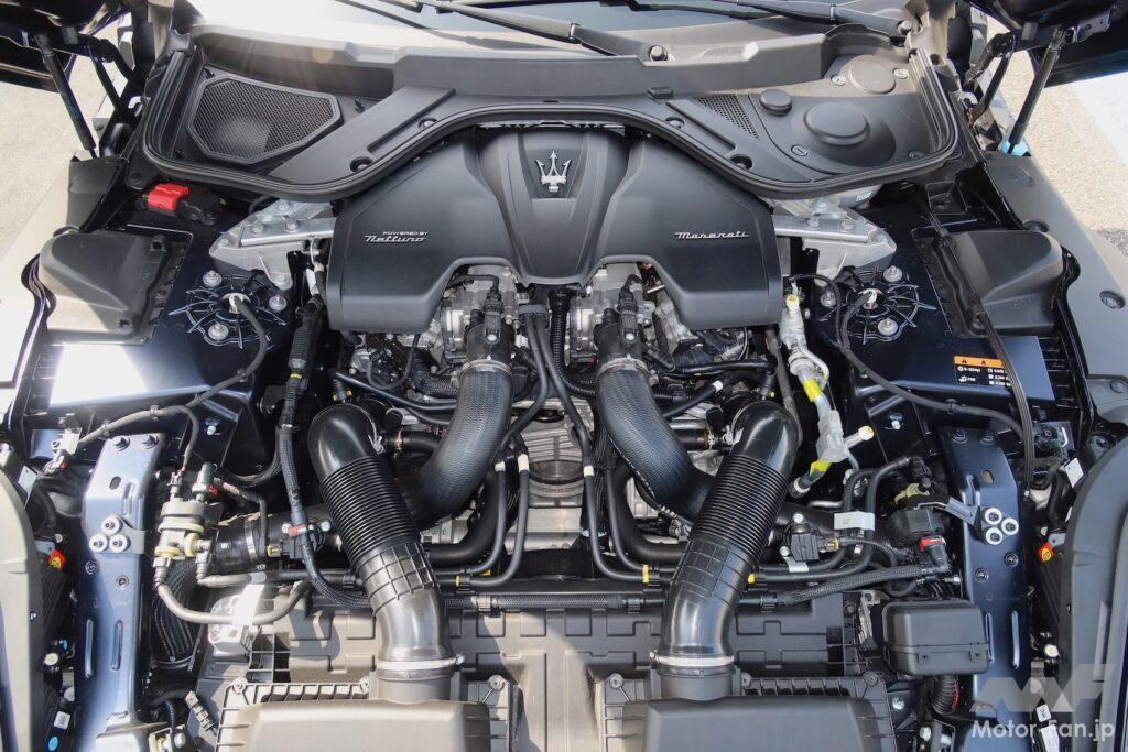 グレカーレのトップグレードに位置するトロフェオのパワートレーンはグラントゥーリズモと共通で、4WDであり、8速ATとの組み合わせであり、ウエットサンプだ。MC20のネットゥーノとグラントゥーリズモ/グレカーレのネットゥーノの相違点は、後者がオンデマンドシリンダー、つまり気筒休止システムを備えていることである。低車速低負荷時など特定の条件下では右バンクの3気筒が休止し、より高効率に運転する。