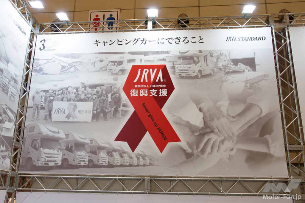 ジャパンキャンピングカーショーで掲げられていた日本RV協会のスローガン。能登半島地震では、全国から応援にくる自治体職員の拠点として計60台のキャンピングカーを提供したそうだ。