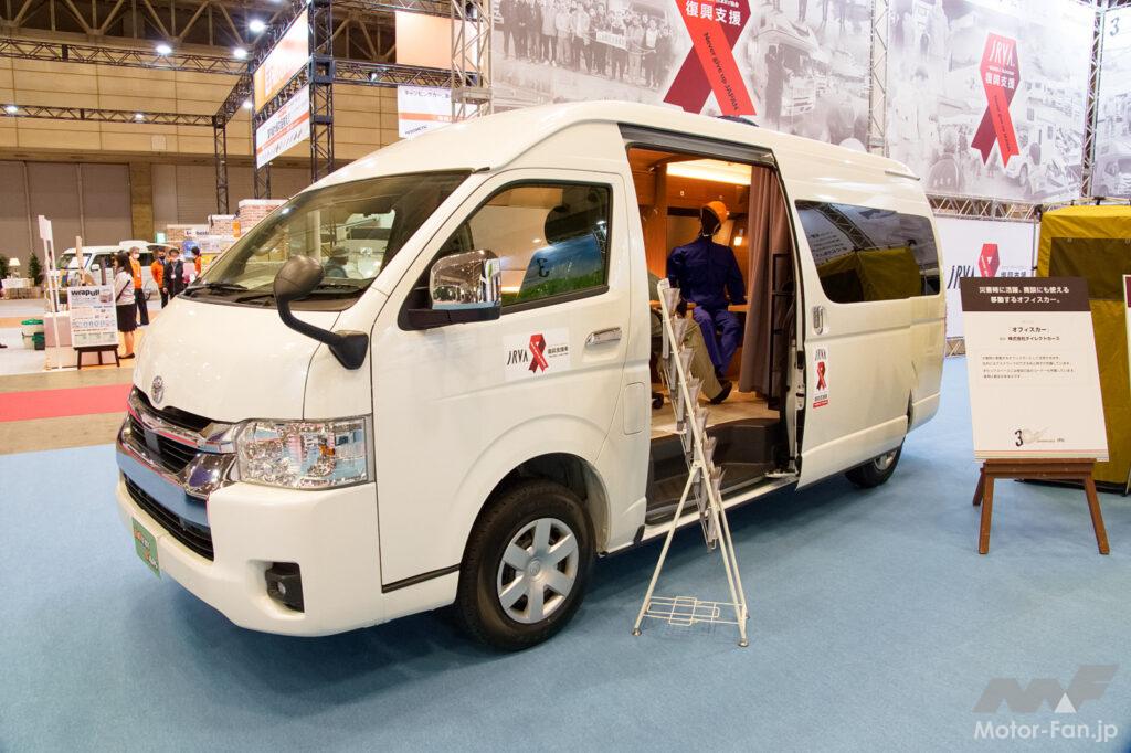 ジャパンキャンピングカーショーで日本RV協会のブースに展示されていた車両。100V電源、エアコン、FFヒーター、デスク、会議スペースなどを装備しており、ボランティア団体などの活動拠点として活用することを想定している。