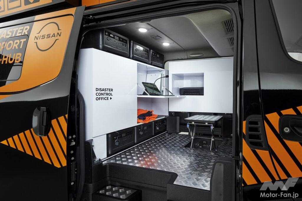 これ1台で災害対応オフィス、応急処置スペース、充電ステーション、情報入手場所、トイレ、キッチンなど、マルチに活躍できるハブとしての役割を担っている。<出典:日産自動車>