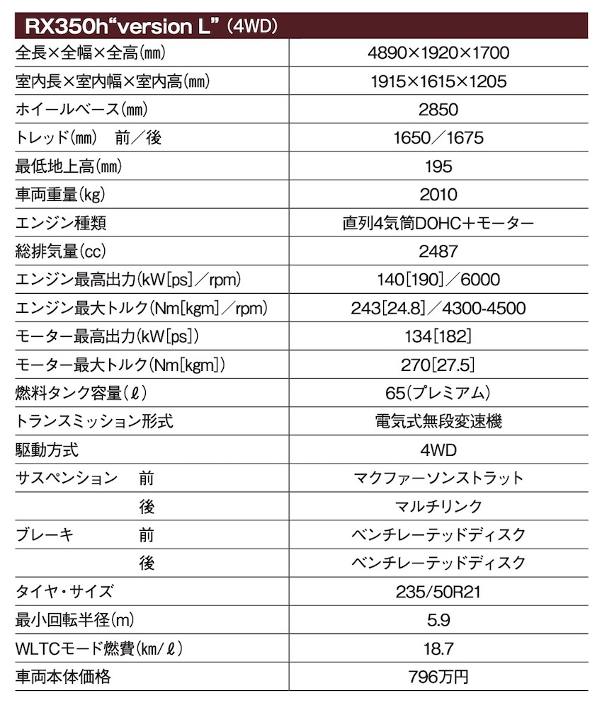 フルモデルチェンジ 22年11月18日 月間販売台数 1956台(23年6月~11月平均) WLTCモード燃費 20.2km/ℓ※「RX350h“version L”」のFF車