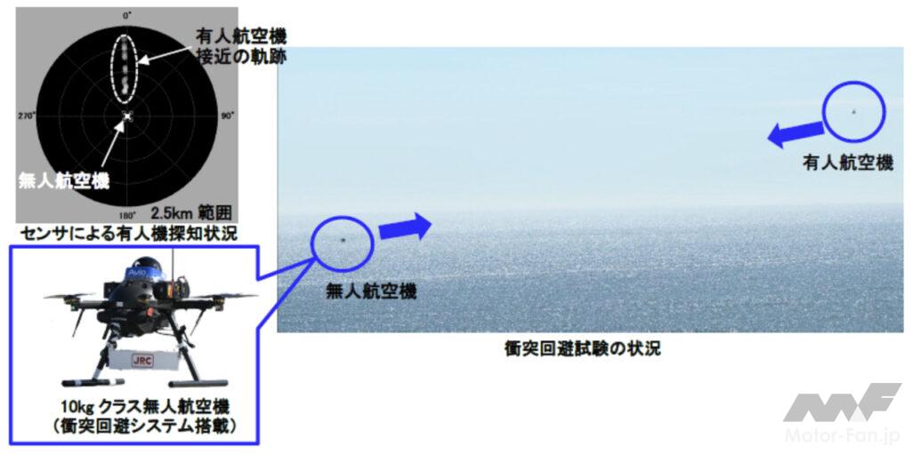 今回の試験は、国立研究開発法人新エネルギー・産業技術総合開発機構(NEDO)の「ロボット・ドローンが活躍する省エネルギー社会の実現プロジェクト/無人航空機の運航管理システム及び衝突回避技術の開発/単独長距離飛行を実現する運航管理機能の開発(離島対応)」の一環として実施されたもので、10kgクラスの無人航空機と有人ヘリコプターを、相対速度200km/h(無人航空機:50km/h、有人ヘリコプター:150km/h)で各々の正面方向から接近させ、無人航空機に搭載した各種センサの探知データに基づき、衝突を回避する経路をリアルタイムで生成して、この回避経路に沿って無人航空機が自律回避飛行することを確認。また、有人ヘリコプターを回避した後、無人航空機が元の飛行経路に復帰することも確認された。