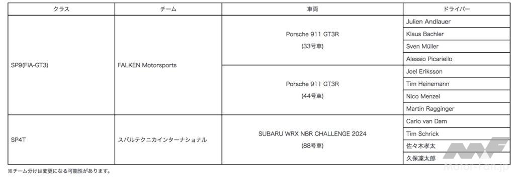 なお、2008年より「ニュルブルクリンク24時間レース」にてチームを率いてきた辰己英治総監督は、このレースが最後の挑戦となる。今年も全国のスバル販売店から選抜された8名のメカニックがチームに参加しチームをサポート。ファルケンは、ドライ・ウエットグリップ性能や耐久性能など、総合性能を高めたタイヤを供給し、チームの足元を支える。