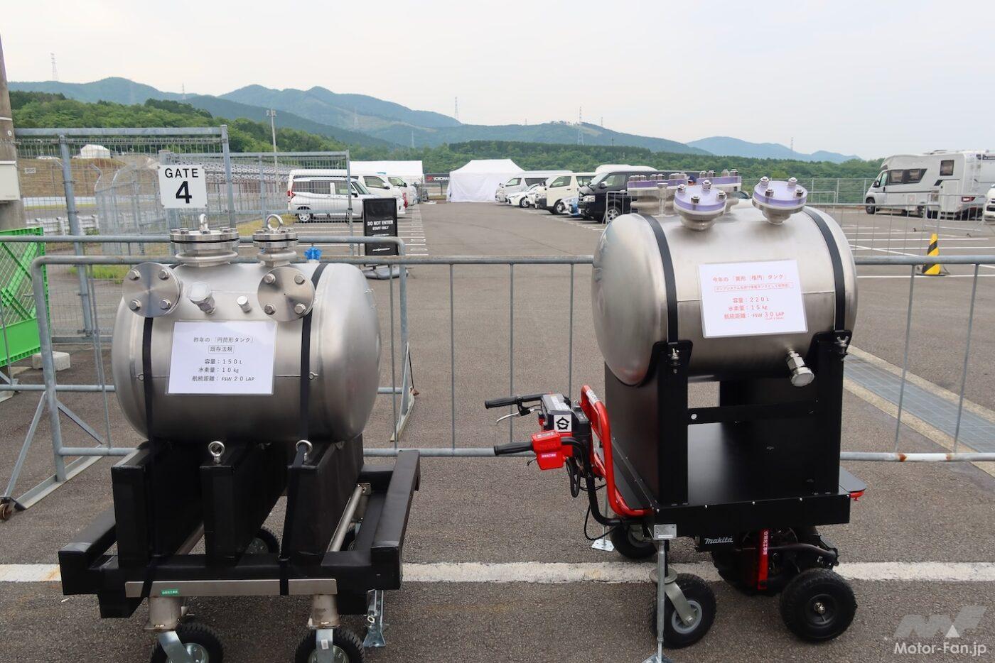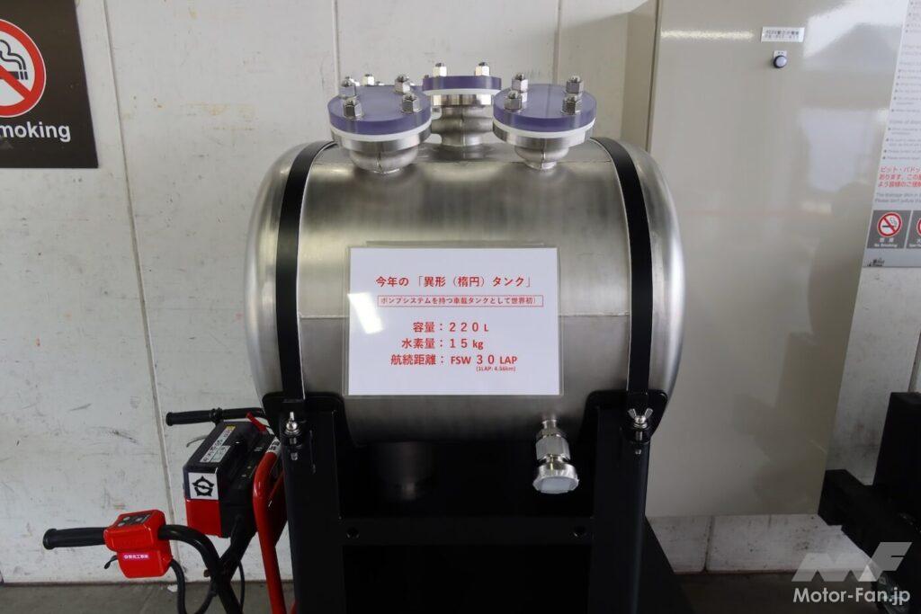 2024年の液体水素エンジンGRカローラは、タンクの形状を円筒形から異形(楕円形)に変えることで車内のスペースを効率良く使えるようになり、容量は1.5倍になった。詳しく記すと、2023年の円筒形タンクは容量150L、水素量10kgだった。2024年の異形(楕円形)タンクは容量220L、水素量15kgだ。富士スピードウェイでの周回数は30周に増えることになる(実際には31周を達成した)。