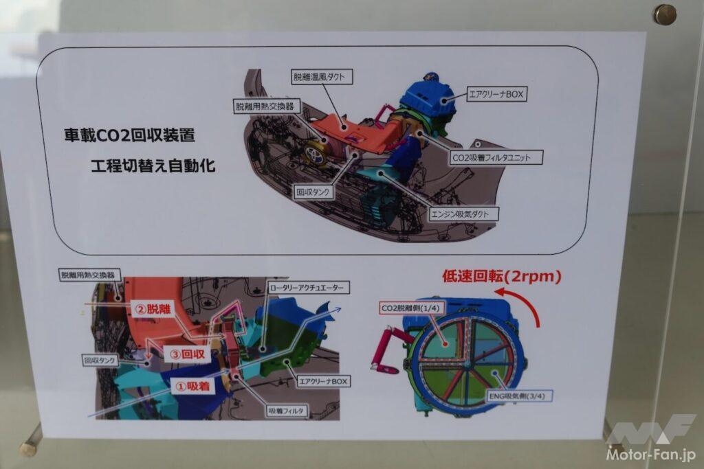 新型のCO₂回収装置は、大型のフィルターが2rpm(1分間に2回転)程度で回転する。フィルターの4分の3程度をCO₂吸着ゾーンとし、ゆっくり回転する間にCO₂を吸着させると、残りの4分の1のゾーンで、エンジンオイルの熱を利用して離脱させる。