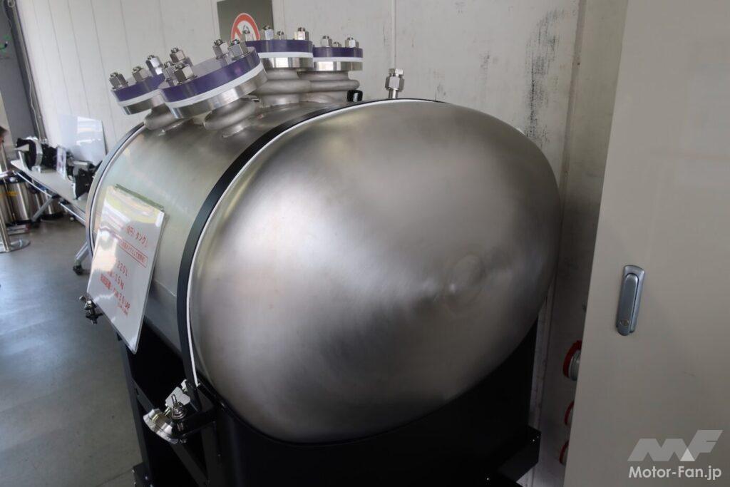気体水素は70MPa(約700気圧)の高圧で貯蔵するが、液体水素は1MPa(約10気圧)MPa以下なので、金属のタンクとしてはそれほど厳しい圧力ではないという。強度の面で円筒形である必然性はないのだが、法整備を進めていくためにはきちんと安全性を保証する必要があり、現状は過剰なまでに安全性に気をつけた設計になっている。