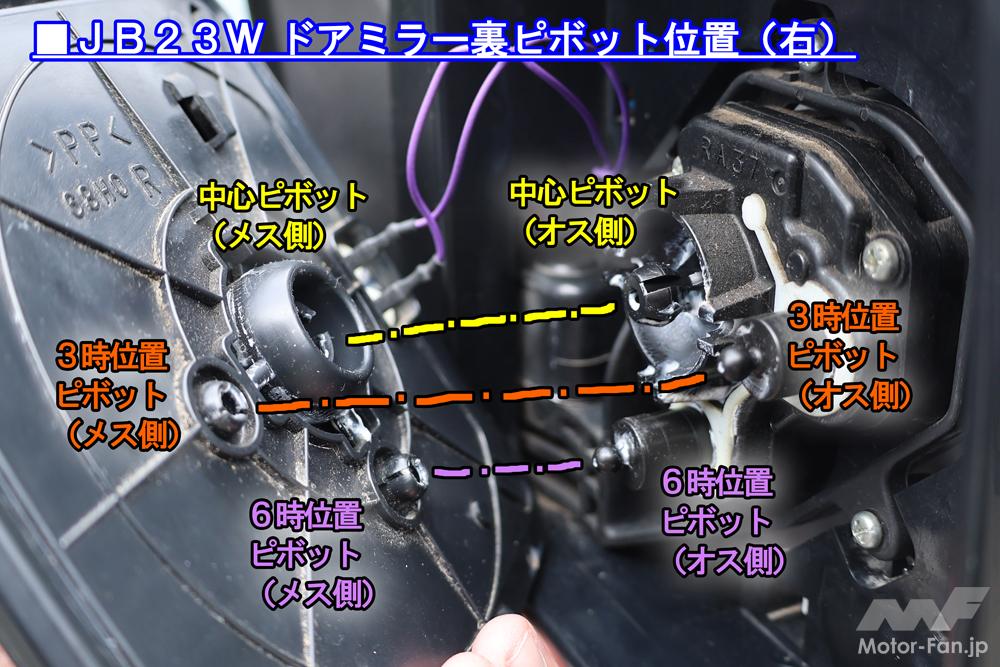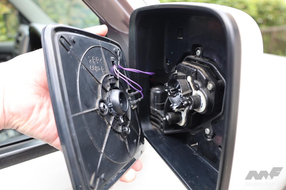 はめた後にミラーを手で上下左右に動かし、ガリガリ音がすれば3つのピボットにきちんと差し込まれた証拠だ。このガリガリ音は上下左右調整モーターからの音だ。