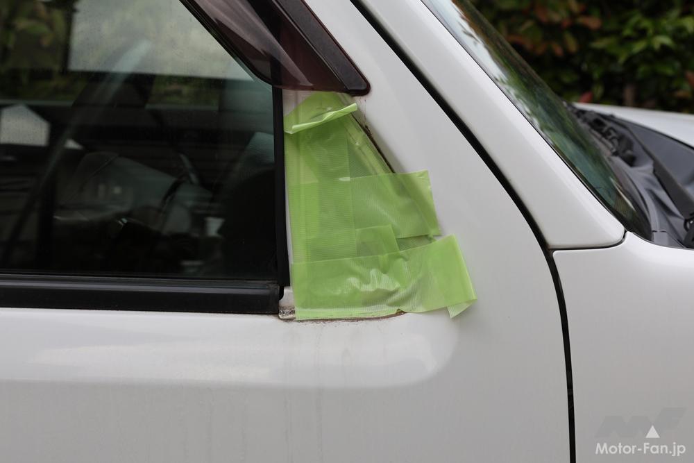 昨夜ふさいでおいたドア側取り付け穴のテープをはがす。穴のまわりがまあ汚れていたこと。