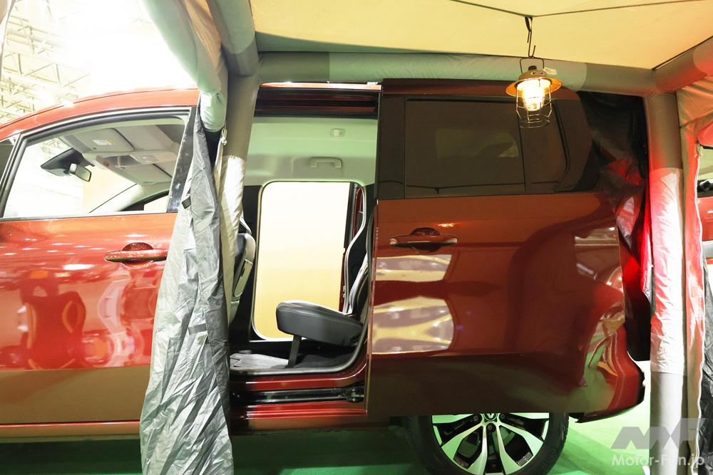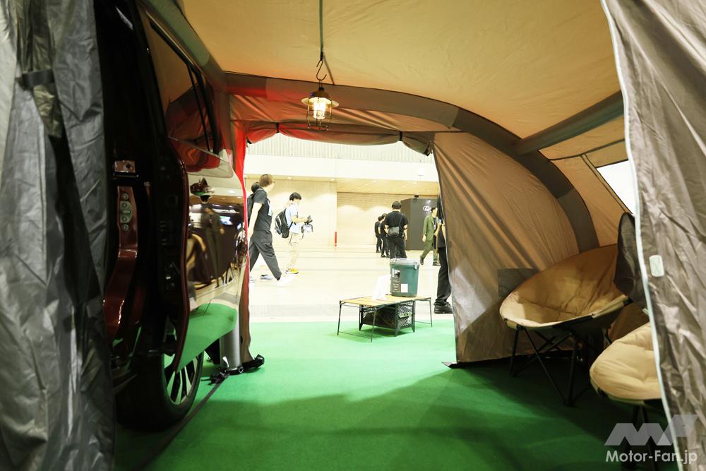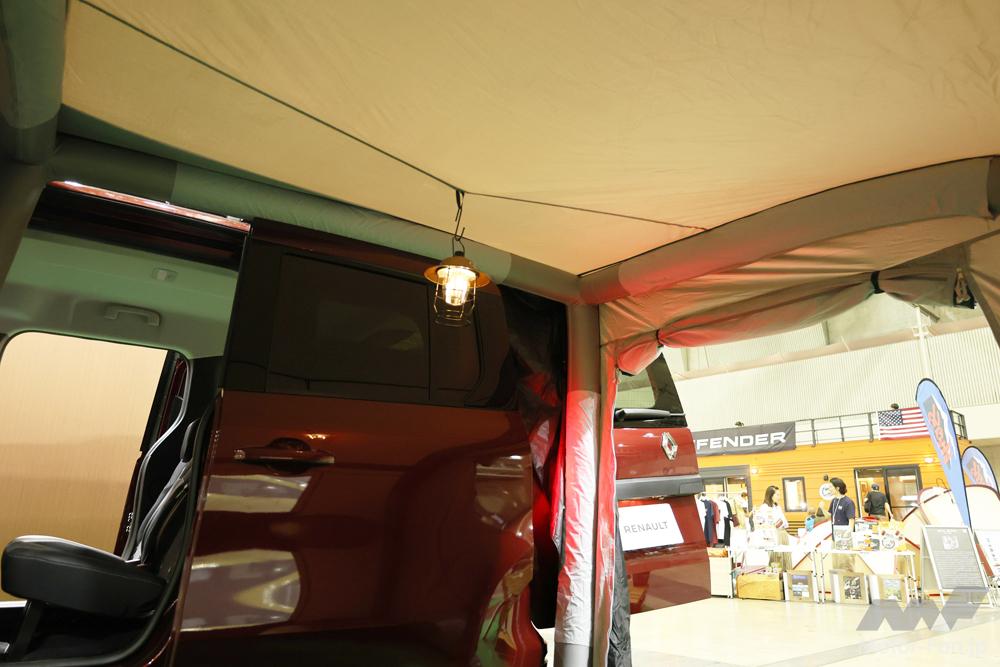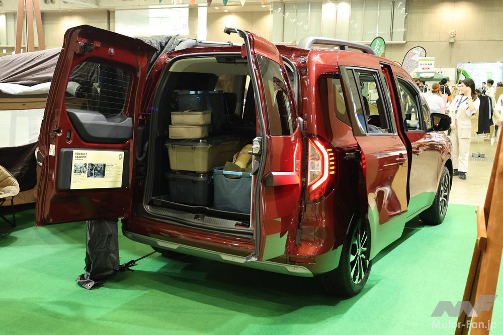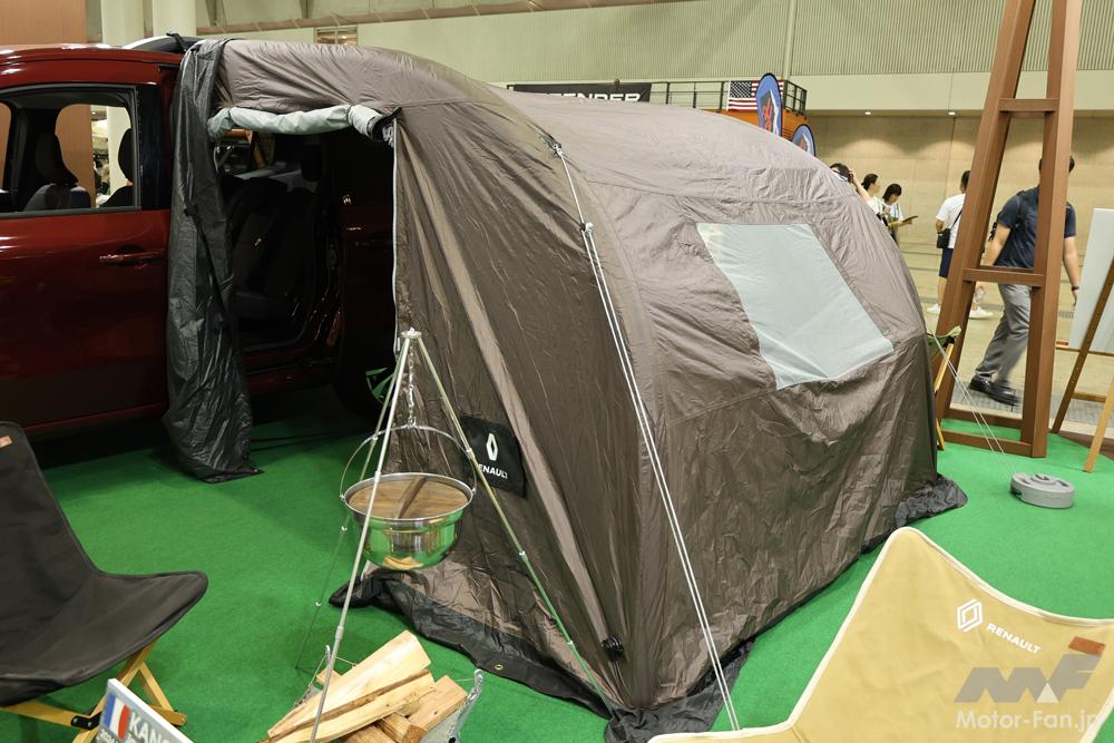 このブースで筆者が気に入ったのが、写真左のルノーカングーの特別仕様車「Variete(ヴァリエテ)」のスライドドアに接続されたタープだ。