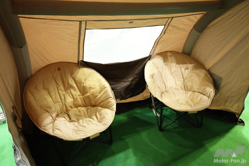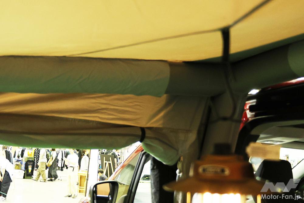 中に設置された折りたたみチェアに身をゆだねて中を見渡すと、地面が緑色のマットということもあってなかなか楽しい雰囲気がある。タープの中でそのままクルマと行き来できるのは便利だし、平素使っているクルマをこのような視線で眺めるだけでも楽しい。自宅の車庫に設置すれば、遠方でカングージャンボリーに出向けないひとだってアウトドア気分に浸れるというものだ。子どもに過ごさせたら大喜びすることまちがいなし!