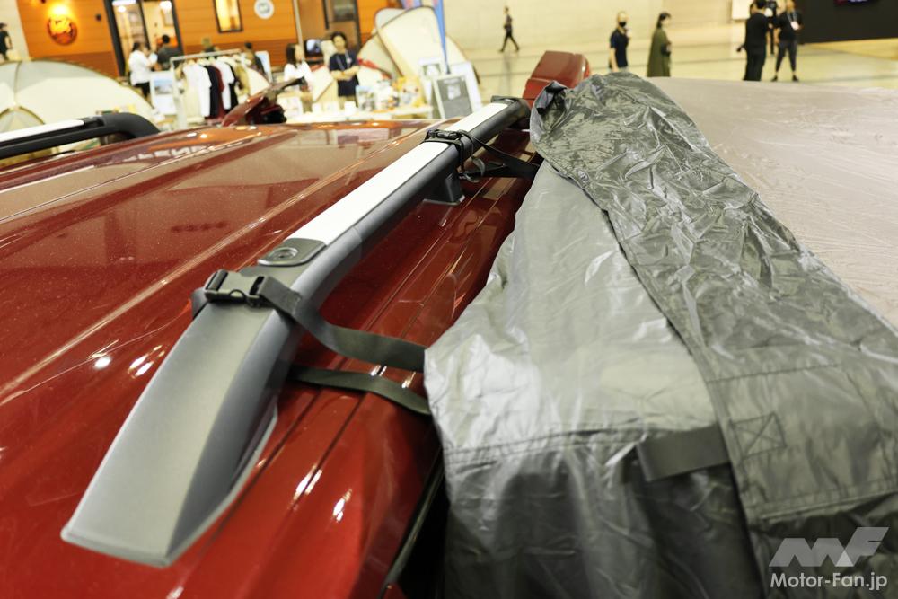 この「カーサイドエアフレームタープ」は名のとおり、カングーのルーフレールにひもをくくりつけて使うものだが、「カーサイド」というから右左に制約はないというし、バックドアを開けたリヤ側にも使えるという。ということは、展示車のような左サイドのほか、リヤ、右サイドと最大3つ使える勘定だ。