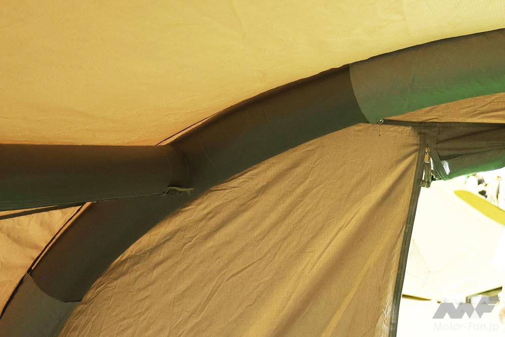 特に説明はなかったが、設営時やしまうときに軽いのが利点だろう。出入りのときや中で動きまわるとき、フレームに頭をぶつけたが、鉄製でないぶん「あいたっ!」なんていうことにならなくてすむのもエアフレームならではのメリットだと気づいた。その代わり、中にぶら下がっていたランタンに頭を2回ぶつけたのはないしょだ。あいたっ!