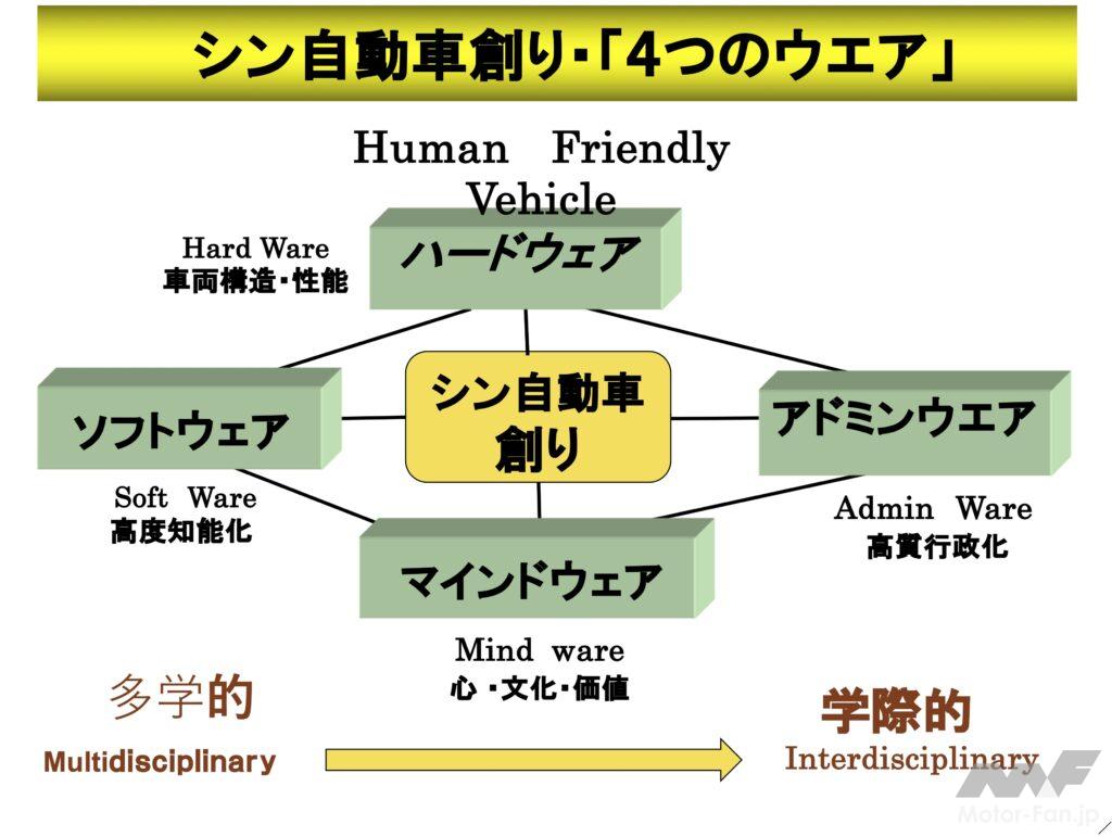 シン自動車創りは、「ハードウエア」や「ソフトウエア」はもとより、新たな価値の創造を育む心と文化「マインドウエア」が不可欠です。そして国際かつ国内的にコトを推進する行政、すなわち「アドミンウエア」が凛として確かなる道を歩むことにより、新たなるクルマ創りの道が拓かれることでしょう。