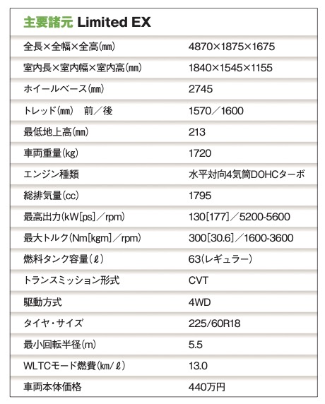 さらに、上級の「LimitedEX」の本革シート装着車にシートベンチレーションおよびクッション長調整機構が新たに追加されたほか、ブラックを印象的に各部に配した特別仕様車が設定された。ワゴン派生型のクロスオーバーながら、悪路走破性を高めるため最低地上高を213㎜も確保したことで、アイポイントがほどよく高めで死角の小さい良好な視界を実現している。独特の雰囲気を見せる外観もアウトバックならではのものだ。