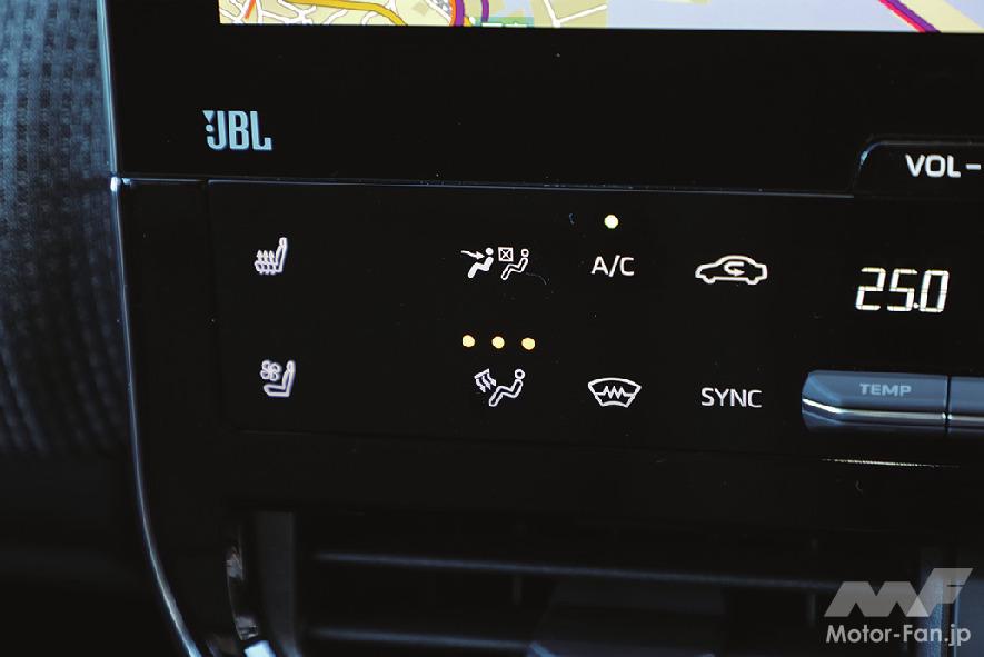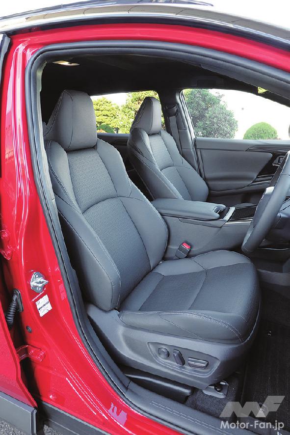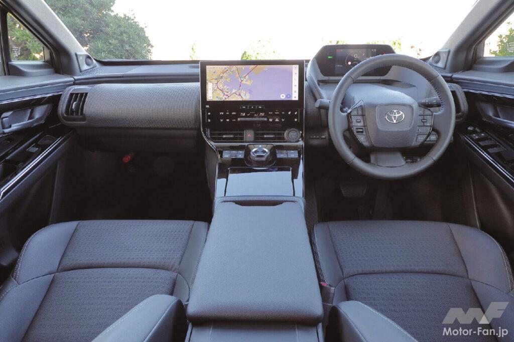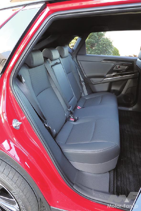 またbZ4Xでは駆動用リチウムイオン電池を床下に設置しているので、床と座面の間隔が不足気味だ。その代わり後席の足元空間は広い。身長170㎝の大人4名が乗車して、後席に座る乗員の膝先には握りコブシ3つ分の余裕がある。ここまで広ければ4名がリラックスして乗車できる。
