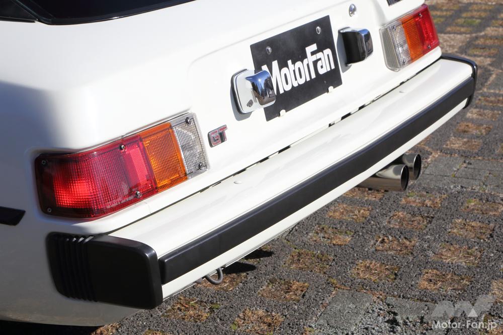 内側から白のリバース、オレンジのターンシグナル、赤のテール&ストップ。赤部分にはリフレクターも内包する。左右独立しているランプは、1980(昭和55)年のマイナーチェンジで国産初の二重スモークレンズに変わるとともに左右ランプを結ぶ黒のガーニッシュが加わり、ナンバープレートがバンパー下に移ってリヤスタイルが一新される。