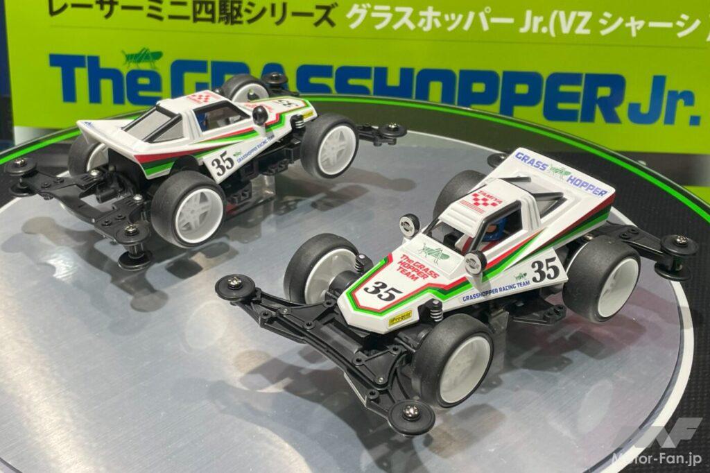 定番の『1/32 レーサーミニ四駆』シリーズには『グラスホッパーJr. (VZシャーシ)』(2024年12月発売予定、予価1320円・税込)がラインアップ。RCグラスホッパーの登場から40年、ついにミニ四駆バージョンの登場だ。シングルシーターバギーをイメージした直線構成のスリムなボディは、シンプルながらスピード感あふれる造形で、ホワイトのボディにグリーンとレッドのラインが入ったカラーリングもRCのイメージそのまま。シャーシは小型・軽量・ショートホイールベースのVZが採用されている。