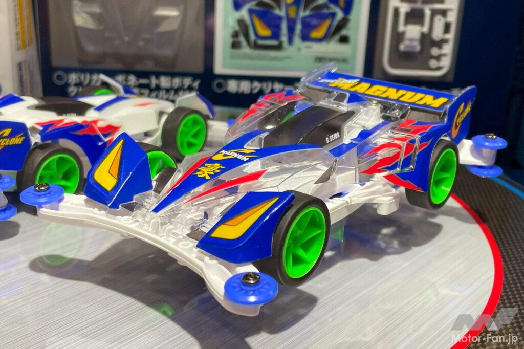 ミニ四駆ブームを確実なものとしたフルカウルミニ四駆シリーズも30周年。それを記念した特別企画、『サイクロンマグナム ポリカボディスペシャル(ARシャーシ) -フルカウルミニ四駆30周年記念』(2024年10月12日ごろ発売予定、予価1320円・税込)もリリース。この記事と同時にすでに店頭に並んでいるかもしれない。シャフトドライブ四輪駆動を採用した高性能レーサー、サイクロンマグナム ポリカボディスペシャルは、フルカウルミニ四駆の誕生30周年を記念する特別仕様。前後のタイヤを覆うカウリングや、迫力の大型リヤウイングが特徴のボディは軽量でショックに強いポリカーボネート製。鋭いノーズからリヤウイングまでを一体パーツとし、スタイルを際立たせるブルー×レッドのカラーリングは専用クリヤーステッカーで再現。30周年を記念するスペシャル感に加え、レースでの戦闘力も高いボディに仕上げられている。また、ホワイトのARシャーシはABS樹脂製。ビビッドな蛍光グリーンのスパイラルホイールには、高いコーナリング性能を発揮するスーパーハード小径ローハイトタイヤを標準装備。実戦向きの軽量ボディと空力性能を追求したシャーシは相性もバッチリ。メモリアルマシンとしてはもちろん、レースでの活躍も楽しみな特別な1台だ。