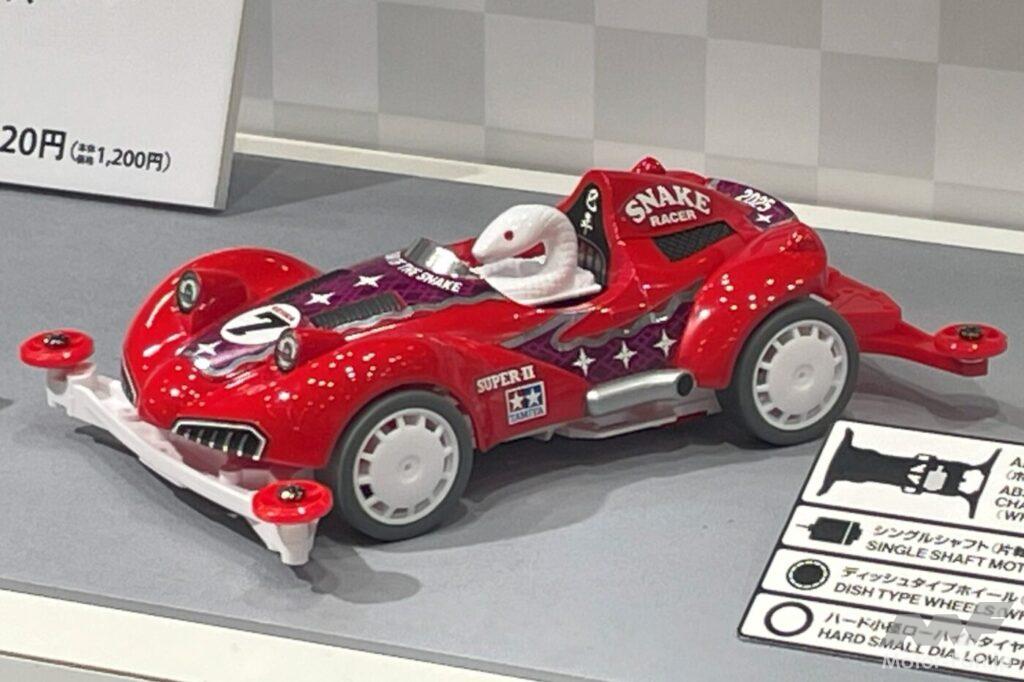 恒例の干支ミニ四駆は来る2025年の干支である巳(み)=ヘビがドライバーのミニ四駆。古代から信仰の対象ともされてきたヘビは脱皮を重ねて成長するだけに「復活と再生」を連想させ、不老長寿や強い生命力につながる縁起の良いシンボルと考えられている。マシンのボディは鮮やかなレッド、シャーシはホワイトのスーパー2が採用された“紅白”仕様。新年を迎えるのにぴったりのカラーリングだ。