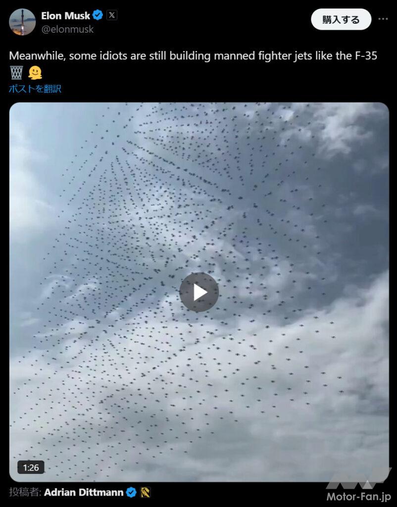 マスク氏は、プログラミングにより編隊飛行する小型ドローンの映像に添えて「いまだに愚か者はF-35のような有人戦闘機を製造している」とポスト。さらに、関連する投稿で「有人戦闘機はミサイルを送り込んだり、爆弾を落としたりするには非効率的。無人機なら、パイロットに掛かるコストなしに、それらの役割を代替できる」とも主張した。