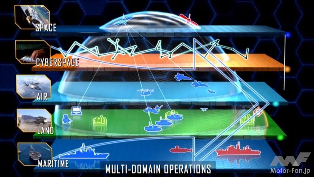 また、今後の戦闘機に求められる役割が、戦闘だけに限られない点も重要だ。戦争全体の様相が、従来の「空vs空」「陸vs空」といった単純なものから、「陸海空・宇宙・サイバー」などの幅広い領域(ドメイン)を横断・連結した、複雑なものへと変化している。こうした戦いは「マルチドメイン作戦(領域横断作戦)」と呼ばれる。